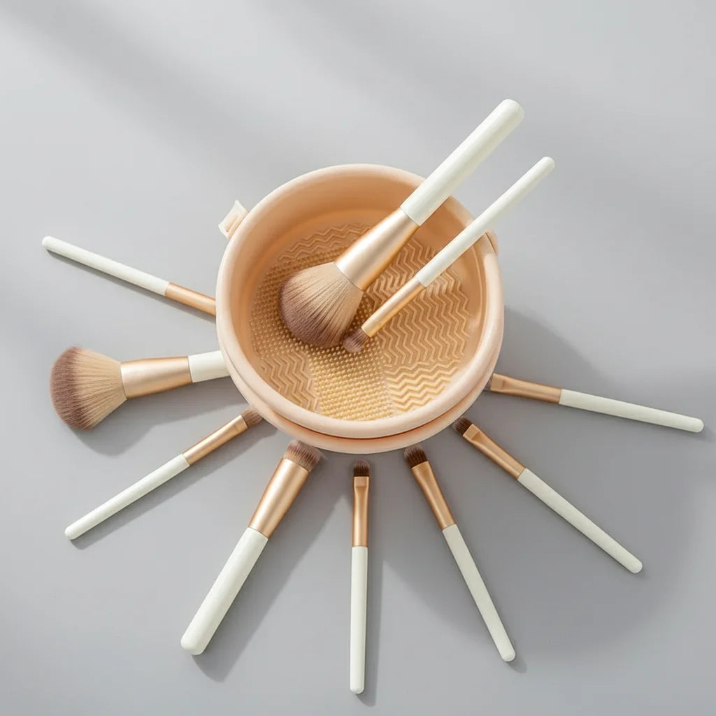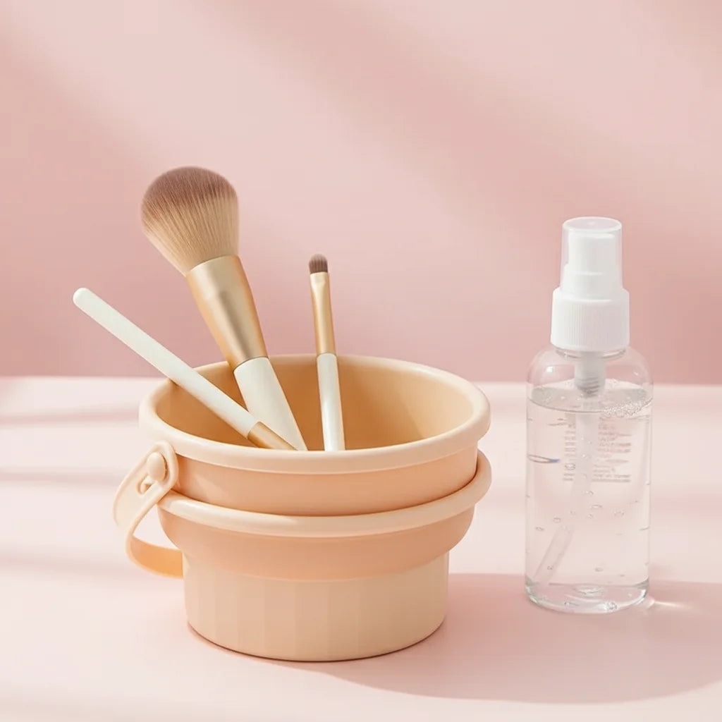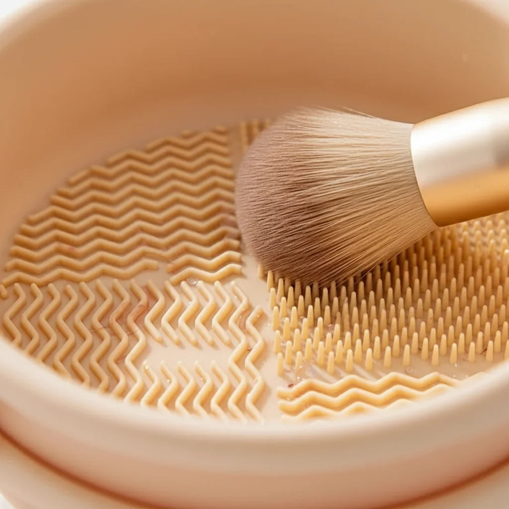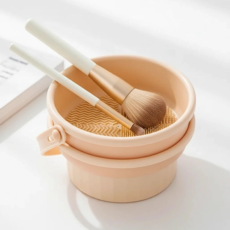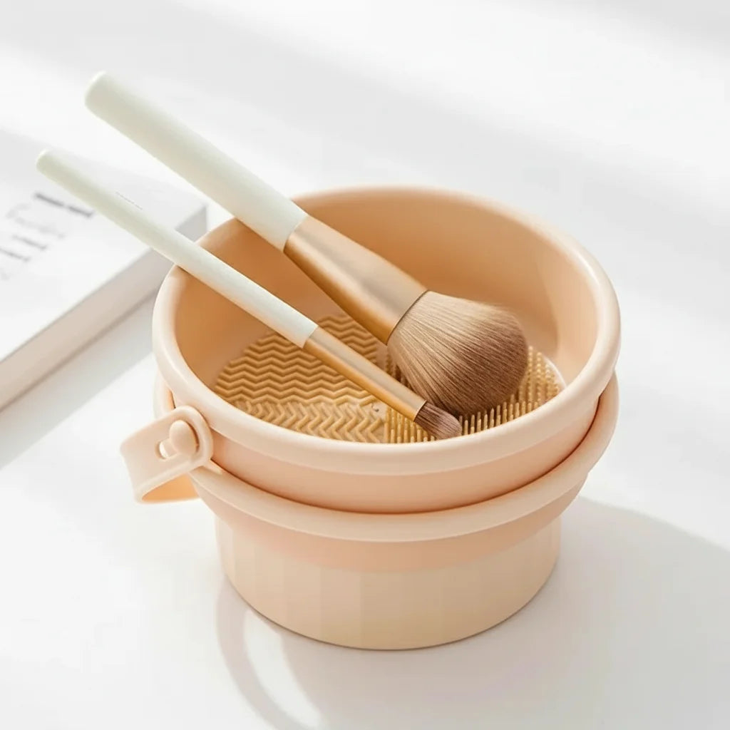 It's ingeniously designed for convenience! The collapsible bowl holds water and cleanser, the textured bottom scrubs, and the flexible material allows for easy rinsing and air-drying. It's your all-in-one solution for sparkling clean brushes, simplifying your routine.